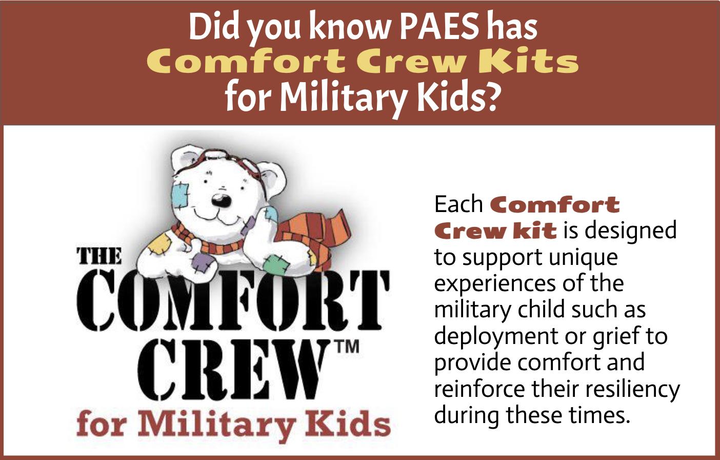 If you feel a Comfort Crew Kit would be helpful for your child please reach out to the Military & Family Life (MFLC) Counselor, Mr. Pinner at 757-323-3310 or pinnerlpct@MagellanFederal.com.