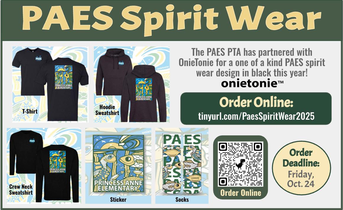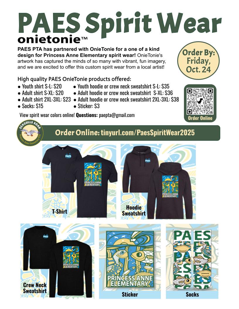 New this year, the PAES PTA has partnered with OnieTonie for a one of a kind design for Princess Anne Elementary spirit wear!